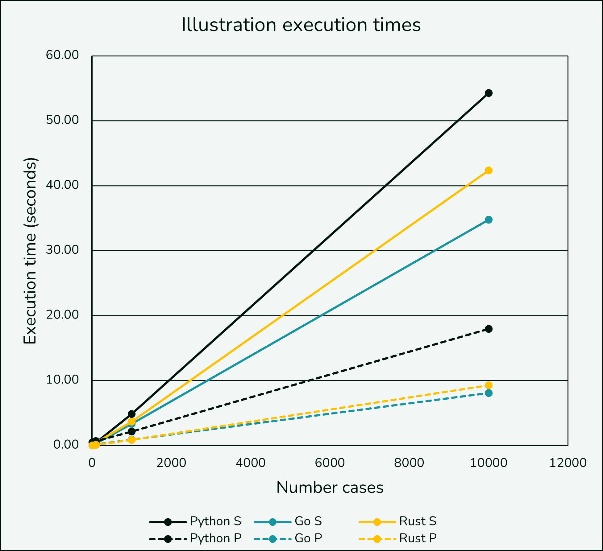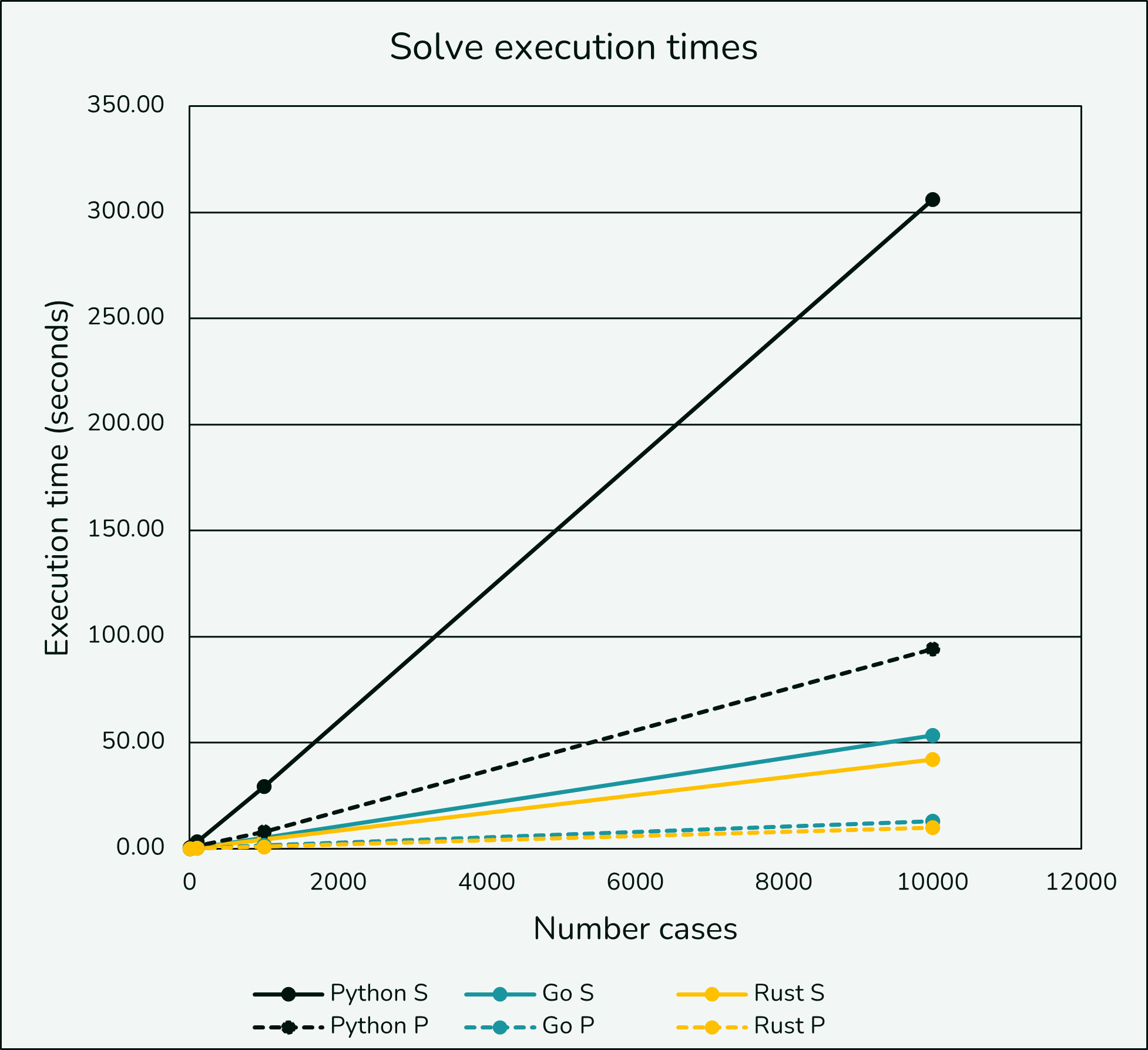I also looked at running the Python, Go, and Rust implementations with 10, 100, and 10,000 cases and did not find much unexpected. The only notable thing is the parallel Python implementation seemed to suffer at low case count presumably from additional worker overhead.