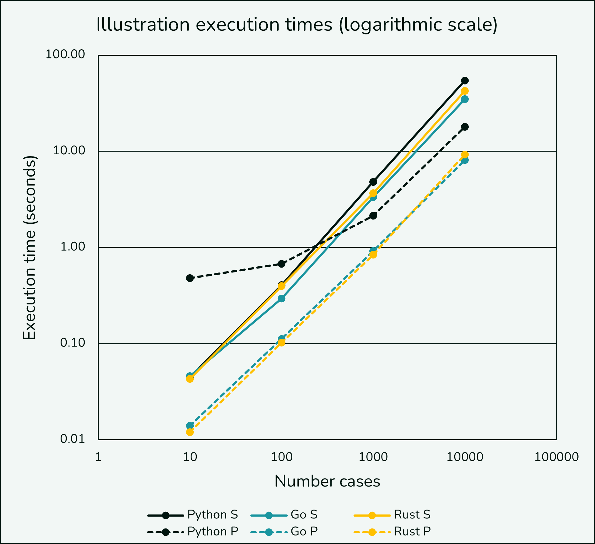 The logarithmic view is helpful and we still see parallel Python getting penalized at low case counts but it overtakes single threaded Python sooner. Note that Go and Rust with single workers appear faster than parallelized Python in this testing and there is nearly a whole order of magnitude difference between parallel Python and parallel Rust.